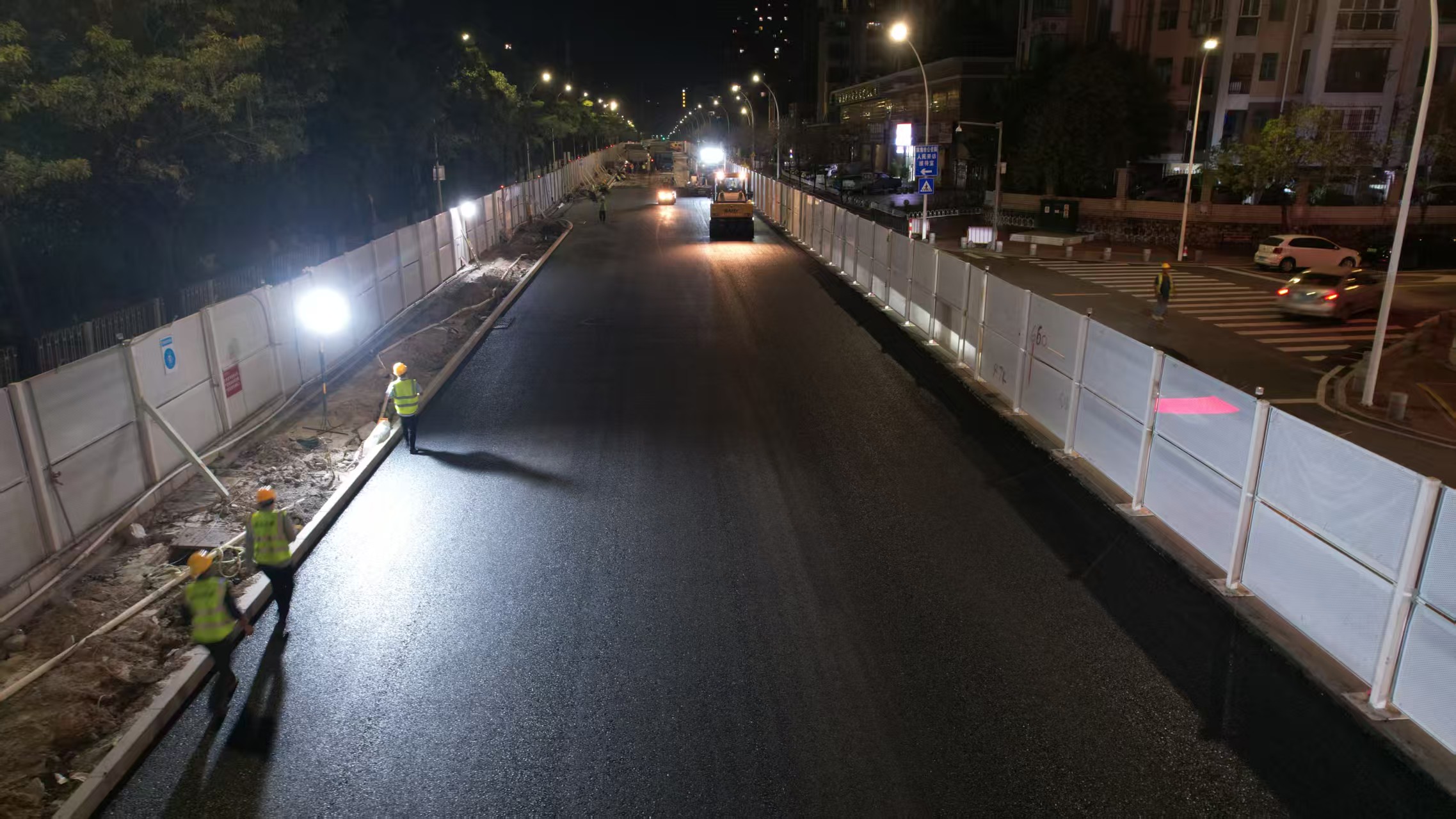 摊铺现场机械轰鸣,热浪蒸腾。运料车有序卸料,大型摊铺机、压路机高效配合,施工人员顶着热浪科学组织施工生产,精细把控摊铺质量。经过近20小时的连续作业,敬业路段全长800米,面积9600余平方的沥青摊铺作业顺利完工。经实地检测,路面压实度、平整度及摊铺厚度均满足设计要求。至此,该项目总长1600米的开挖施工段路面恢复工程全部完工。